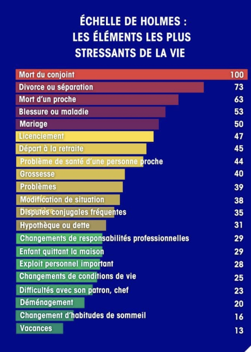 L’échelle de Holmes et Rahe permet de mesurer le niveau de stress face à un évènement et de déterminer la probabilité que la santé soit affectée dans les jours qui suivent.